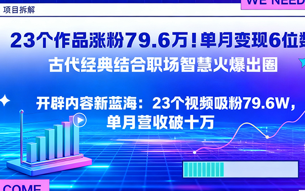 项目名称:AI经典智慧短视频变现项目 项目简介 本项目核心为AI视频创作,通过将古代经典智慧(如处世哲学、谋略思想等)与现代职场场景深度结合,以“借古喻今”的方式精准切入内容市场。视频采用言简意赅的文案与娓娓道来的叙事风格,形成独特的内容辨识度与情绪共鸣点。 数据表现(已验证) • 发布作品:23条 • 运营周期:约1个月 • 粉丝增长:79.6万 • 点赞总量:1148.9万 • 变现能力:单月收益达六位数级别 项目优势 • 内容壁垒高:传统文化+职场痛点的组合,具备持续创作空间与深度价值 • 用户粘性强:内容引发共鸣,互动率和分享意愿显著高于普通题材 • 变现路径清晰:支持矩阵起号、知识付费、私域转化等多种模式 • 技术门槛低:依托AI工具实现高效内容生成,可批量操作 适用人群 • 具备基础短视频运营经验的创作者 • 希望布局文化类或职场类赛道的团队 • 有意通过知识IP实现变现的内容创业者